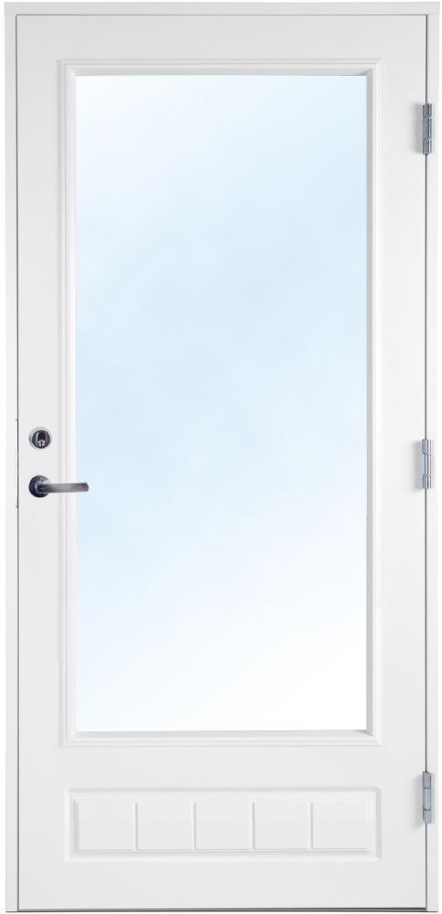 Døren er dekoreret i bunden både indvendig og udvendig. Vinduet er en termoruder isolerrude med Argon, hvilket giver en lav U-værdi. Vinduet på denne dør er udført i sikkerhedsglas, som Boligstyrelsen anbefaler til glasruder lavere end 60 cm fra jorden.