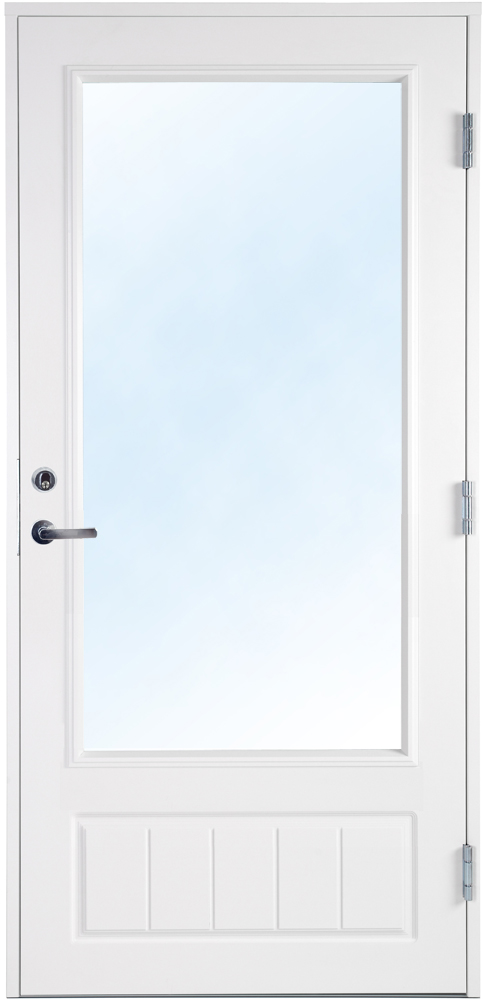 Døren er dekoreret i bunden både indvendig og udvendig. Vinduet er en termoruder isolerrude med Argon, hvilket giver en lav U-værdi. Vinduet på denne dør er udført i sikkerhedsglas, som Boligstyrelsen anbefaler til glasruder lavere end 60 cm fra jorden.