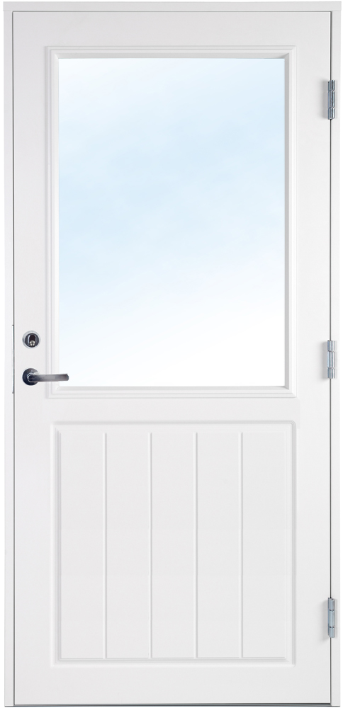 Døren er dekoreret i bunden både indvendig og udvendig. Vinduet er en termoruder isolerrude med Argon, hvilket giver en lav U-værdi.