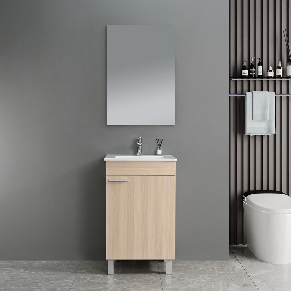 Skabet har en låge med et stilfuldt aluminiumsgreb og en rummelig indvendig opbevaringsløsning. Møblet står solidt på fire fødder og kræver ikke vægmontering, hvilket gør det nemt at placere i forskellige typer badeværelser.