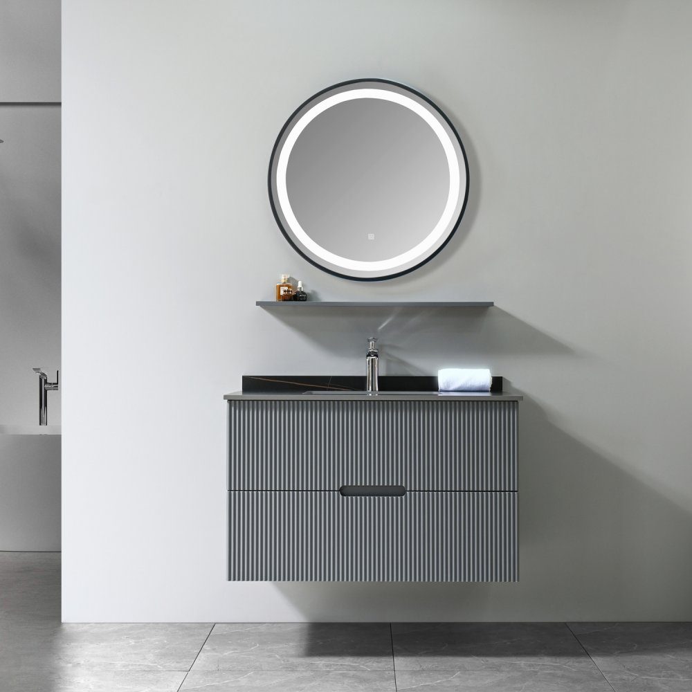Badeværelsespakke Lazien kombinerer moderne design og funktionalitet på en stilfuld måde. Vaskeskabet har en elegant ribbet overflade i grå melamin, som giver et subtilt men sofistikeret indtryk. Den sorte marmorerede top i melamin er en luksuriøs detalje, der løfter hele møblet og giver badeværelset et moderne præg. To rummelige skuffer med soft-close-funktion giver masser af plads til opbevaring og holder badeværelset organiseret og ryddeligt.
