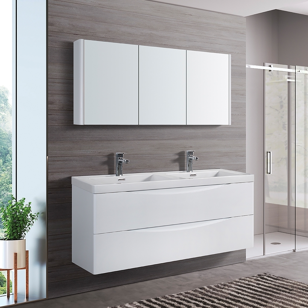 Par badeværelsespakke har en stor dobbelt håndvask, der kan deles med dig og dine kære om morgenen. Badeværelsespakkens design er stilrent og moderne med fokus på funktionalitet og bekvemmelighed. Pakken har desuden et lige så stort spejl, som med tre døre er meget rummeligt og unikt. Spejlet har en hvid yderkant på hver side med det tredelte spejlglas i midten. Håndvasken har to udtræksskuffer med blød lukning og diskret grebsdesign.
