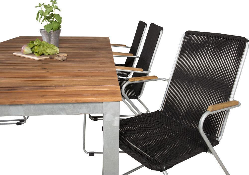 Spisestol med metal understel og sæde af sort reb. Detaljer i akacia.