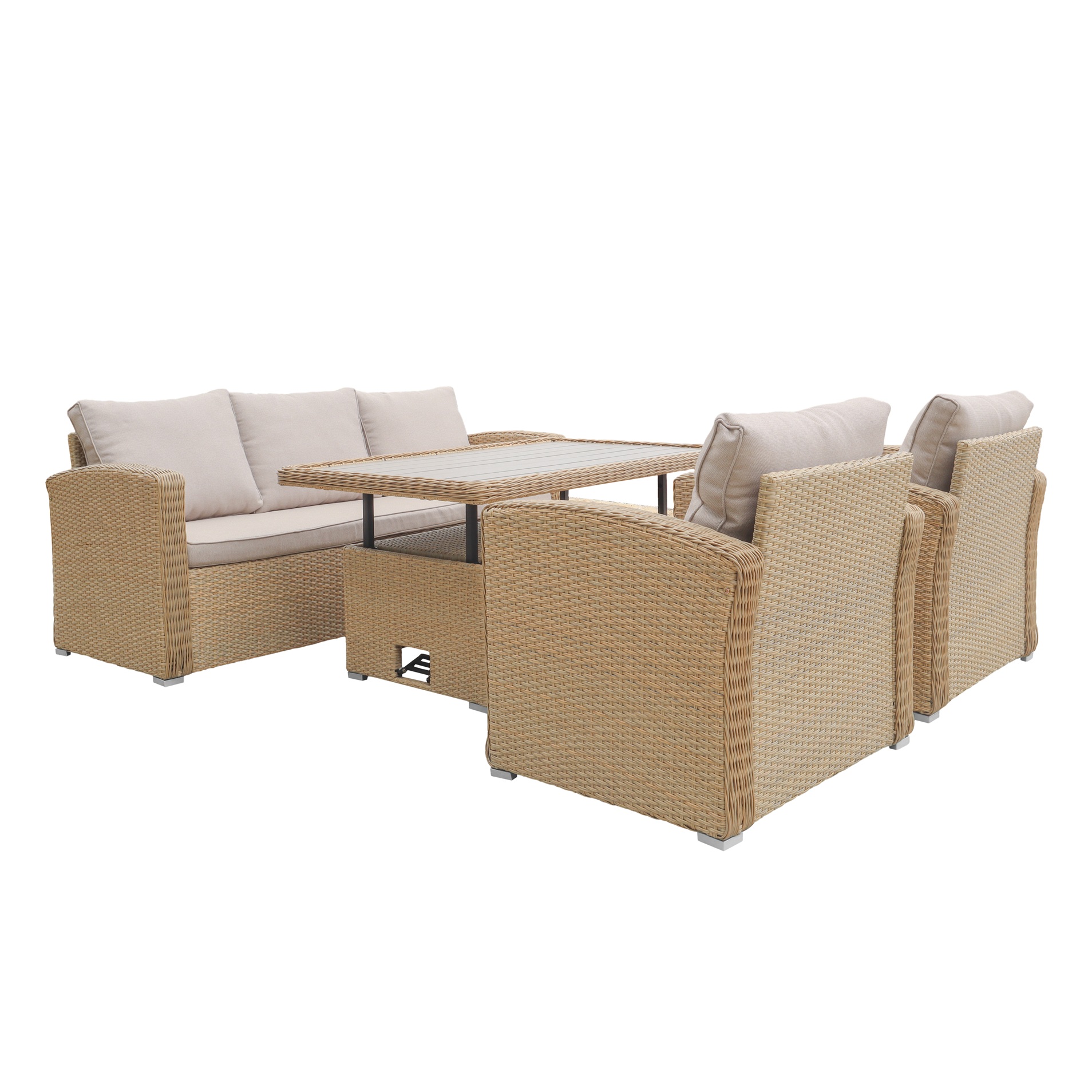 Sofasæt i rundt naturfarvet syntetisk rotting. Udendørsgruppen består af en 3-personers sofa, 2 matchende lænestole og et justerbart bord. Bordet er lavet af syntetisk rotting med gråbeige noonwood, som har høj slagfasthed. Bordet kan bruges som både sofabord eller spisebord ved blot at trykke på bordet.