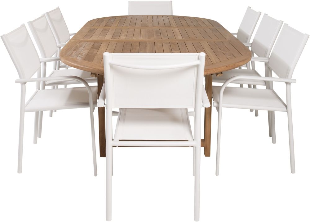 Spisegruppe med et bord og 8 stykker stole. Stolene er lavet af Aluminium/Tekstilerne og bordet er lavet af Teak. Stolene kan stables.