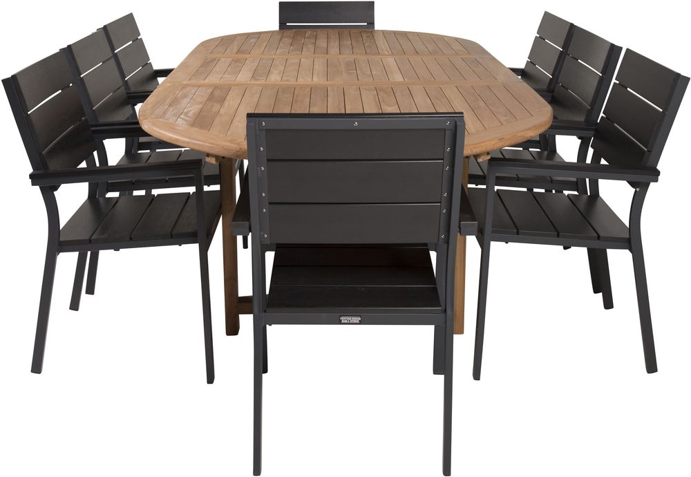 Spisegruppe med et bord og 8 stykker stole. Stolene er lavet af Aluminium/Polywood og bordet er lavet af Teak. Stolene kan stables.