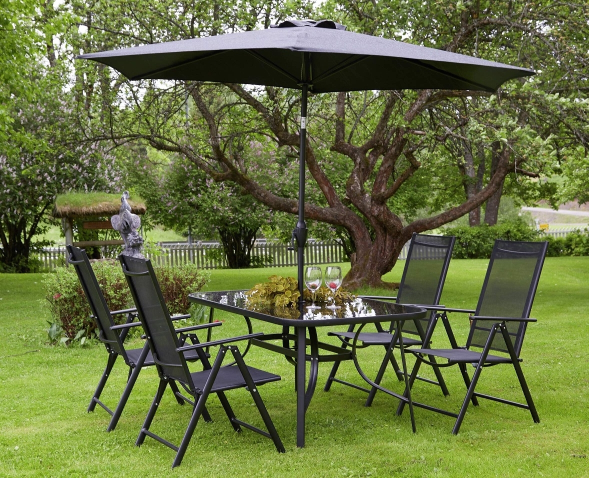 Easy Living By Martinsen, Stilfuldt og praktisk spisestue i sortlakeret design med bord, 4 stole og parasol, alt sammen i en pakke. Den øverste plade på bordet er lavet af hærdet glas. Aluminiumsramme i bord og stol.