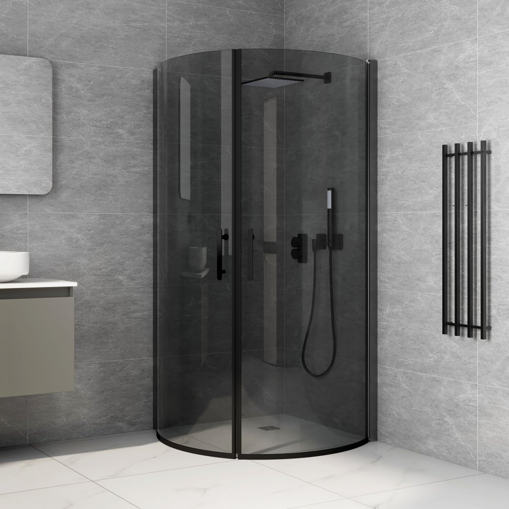 Brusekabine med sorttonet 6 mm hærdet sikkerhedsglas og sorte aluminiumsprofiler. Glasset er tonet for at give et afskærmet bruseområde, og panelerne er monteret i en sort aluminiumsramme. Konstruktionen mangler en gulvbakke og har en lige åbningsløsning, der giver en lav tærskel ved ind- og udstigning.