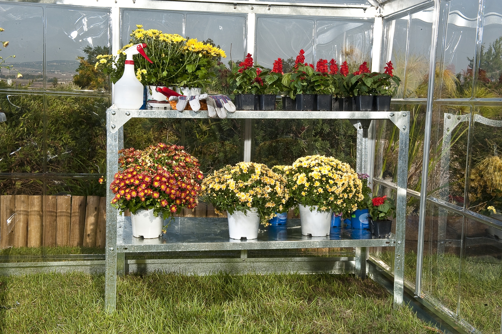 Det justerbare 2-lags metalarbejdsbord er det perfekte reolsystem til at organisere dit drivhusrum. Det giver dig et arbejdsområde til dyrkning med en opbevaringshylde nedenunder. Det kan også fungere i dit skur, garage, have osv. De to hylder giver masser af opbevarings- og arbejdsplads og tillader tung vægtbelastning. Den nederste hyldehøjde kan justeres for at imødekomme dine havebehov. Den er vedligeholdelsesfri, og en af dens vigtigste fordele er den dobbelte anvendelse af den øverste hylde; som hylde til hverdagens havearbejde eller hvis den stilles på hovedet som jordbakke. Lavet af slidstærkt galvaniseret stål, denne bænk er bærbar og nem at samle og kan flyttes hvor som helst, når det passer dig.