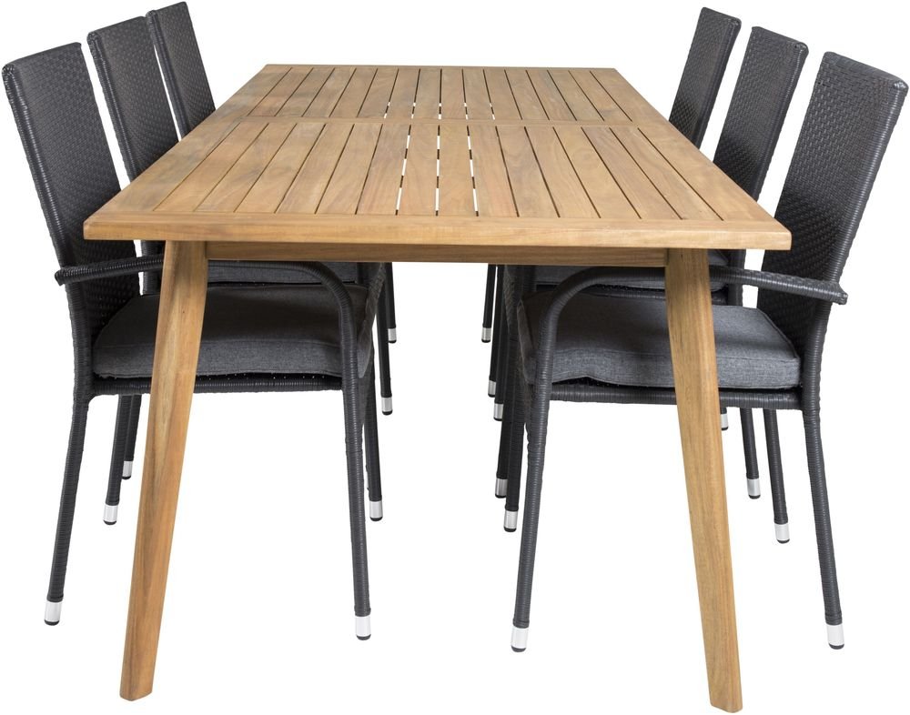 Spisegruppe med et bord og 6 stykker stole. Stolene er lavet af Kunstig rotting/polyester og bordet er lavet af Akacia. Hynder indgår.
