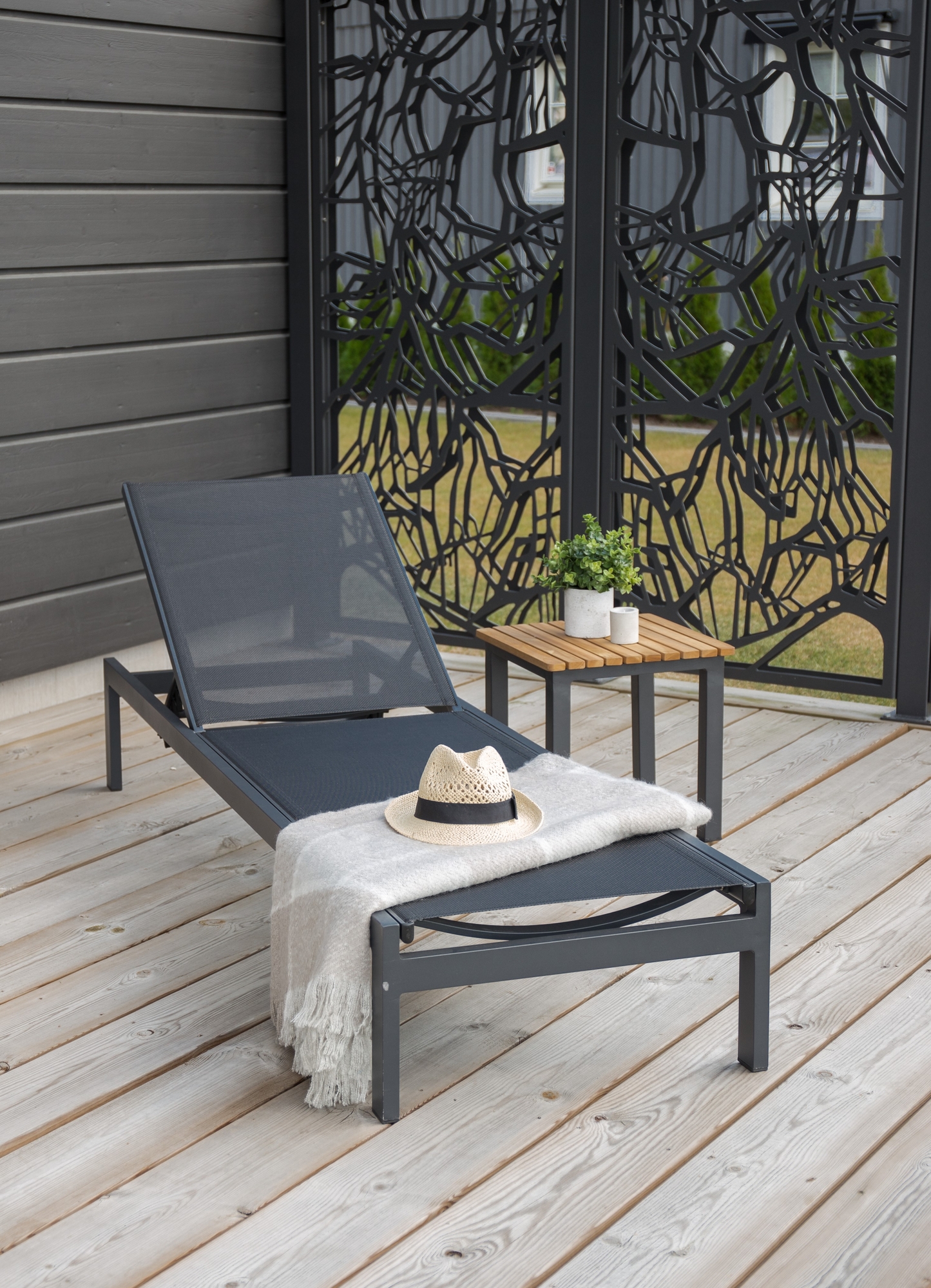 Det stilrene sorte design gør solsengen velegnet til de fleste udendørs miljøer, lige fra haver og terrasser til poolområder. Det slidstærke tekstilmateriale giver både komfort og langvarig holdbarhed, mens den sorte aluminiumsramme giver en moderne og sofistikeret følelse.