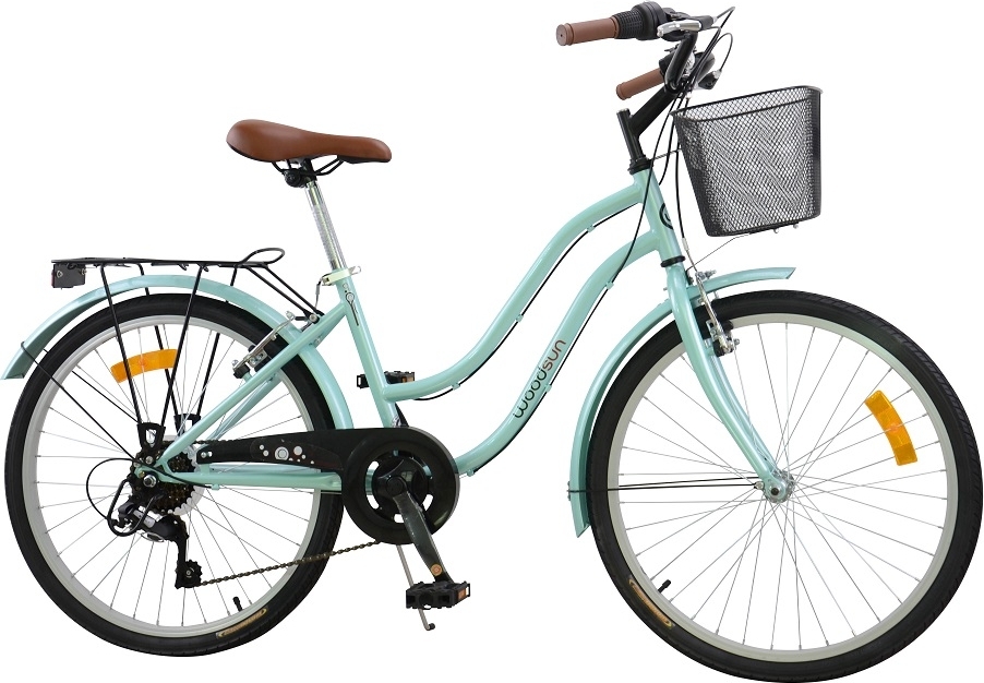 Oplev byens charme med vores elegante damecykel, designet til både stil og funktionalitet. Med sit klassiske design og bløde pastelgrønne farve er denne cykel ikke kun et transportmiddel, men også et modetilbehør, der vender hovederne.