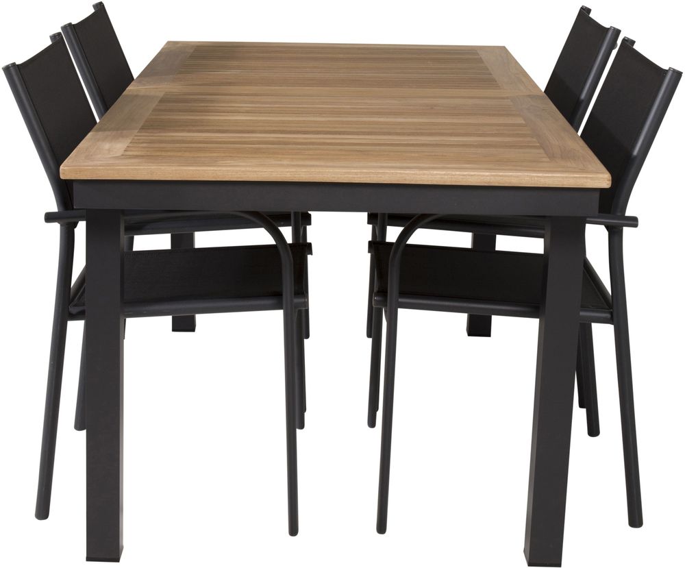 Spisegruppe med et bord og 4 stykker stole. Stolene er lavet af Aluminium/Tekstilerne og bordet er lavet af Teak/Aluminium. Stolene kan stables.