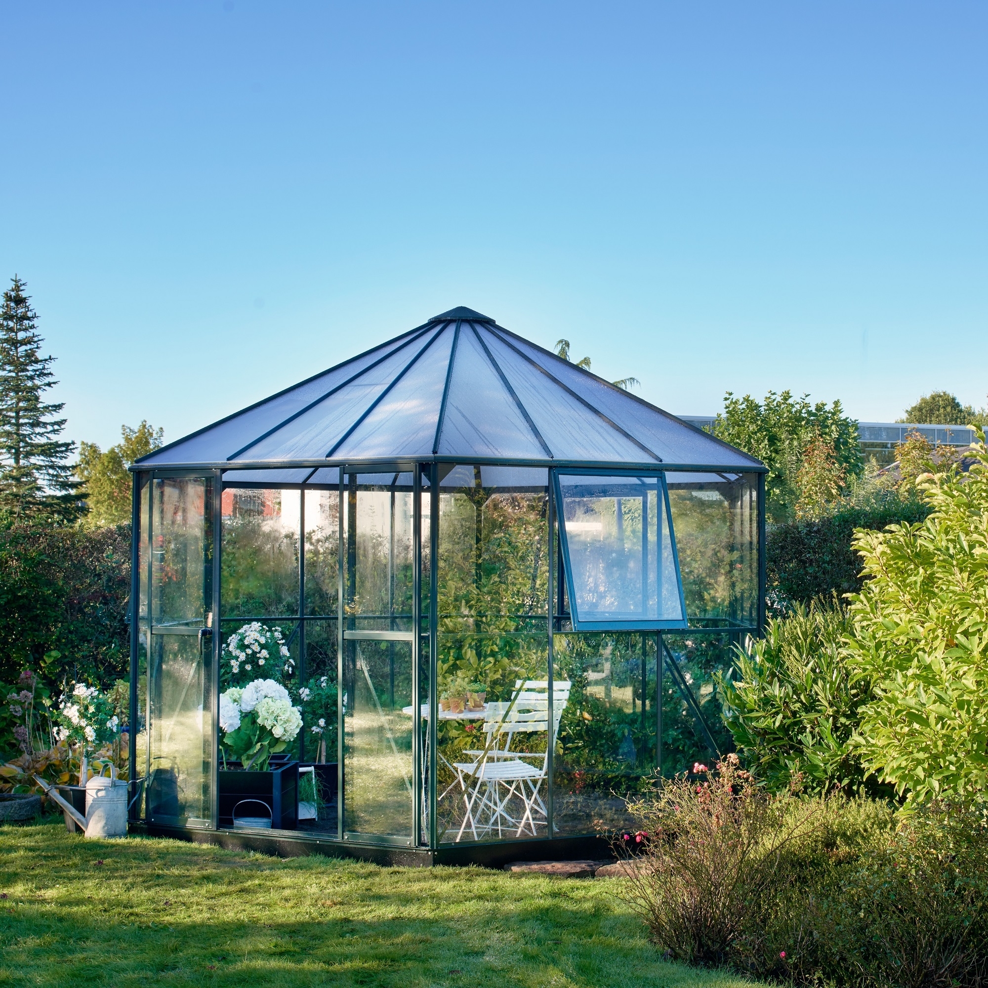 De lange paneler af hærdet glas på siderne skaber et smukt og elegant drivhus, hvor du har fuld udsigt over hele haven uanset vinkel inde i drivhuset.