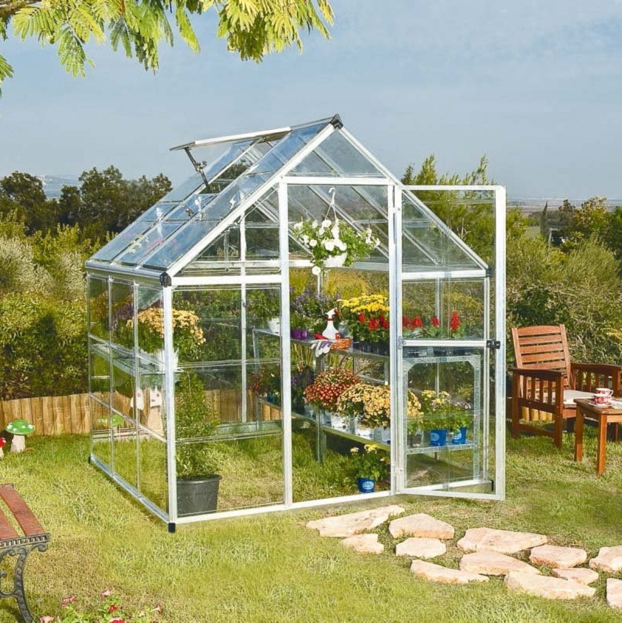 Et drivhus med klare paneler, der udvider anvendelsesmulighederne fra blot at være et drivhus til også at kunne fungere som et lille fritstående uderum, hvis det ønskes.