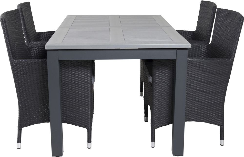 Spisegruppe med et bord og 4 stykker stole. Stolene er lavet af Kunstig rotting/Aluminium og bordet er lavet af Aintwood/Aluminium. Hynder indgår.