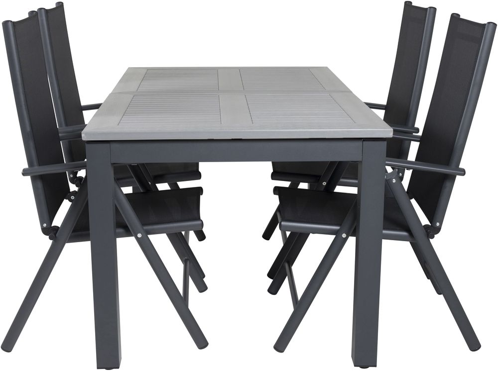 Spisegruppe med et bord og 4 stykker stole. Stolene er lavet af Aluminium/Tekstilerne og bordet er lavet af Aintwood/Aluminium.
