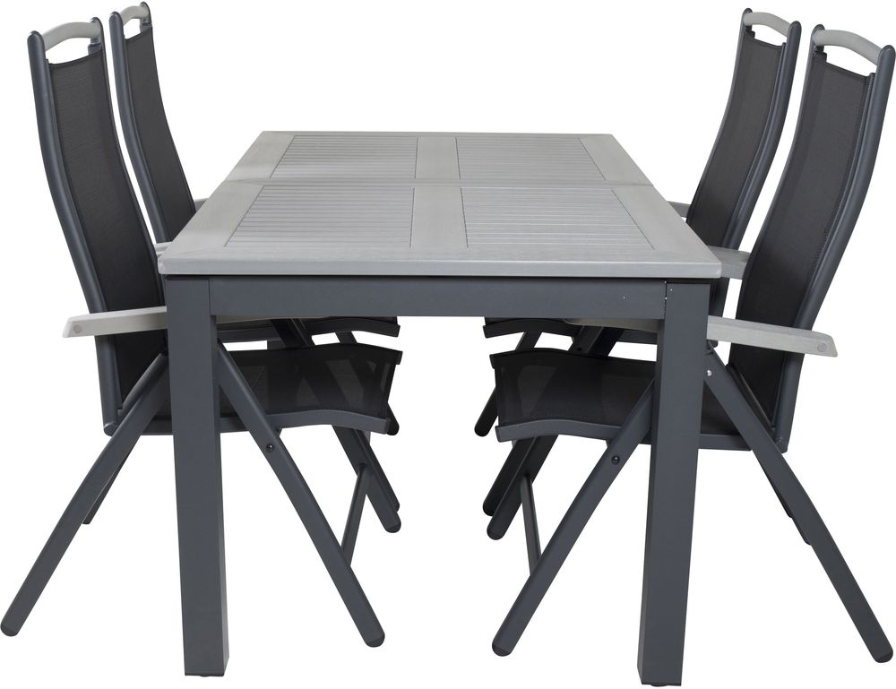 Spisegruppe med et bord og 4 stykker stole. Stolene er lavet af Aluminium/Tekstilerne/Aintwood og bordet er lavet af Aintwood/Aluminium.