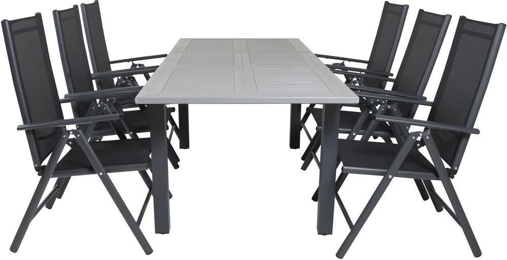 Spisegruppe med et bord og 6 stykker stole. Stolene er lavet af Aluminium/Tekstilerne og bordet er lavet af Aintwood/Aluminium.