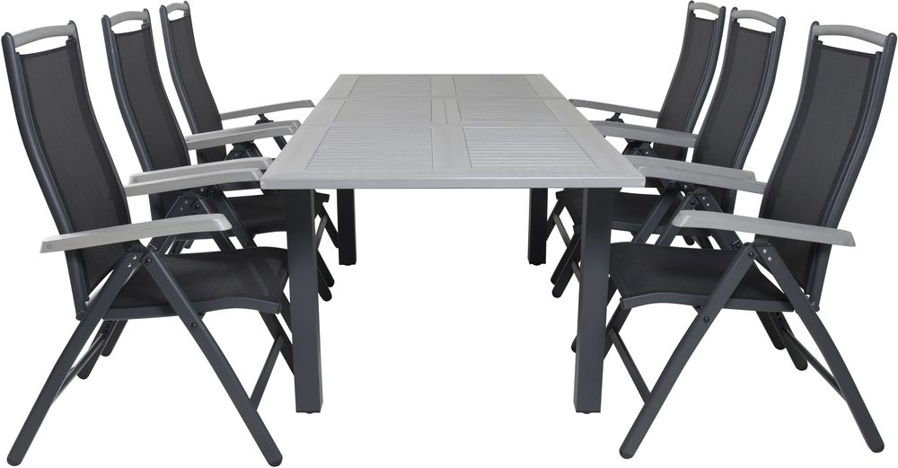 Spisegruppe med et bord og 6 stykker stole. Stolene er lavet af Aluminium/Tekstilerne/Aintwood og bordet er lavet af Aintwood/Aluminium.