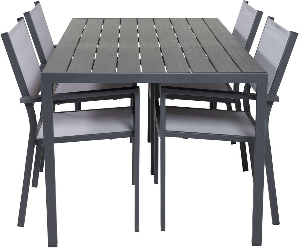 Spisegruppe med et bord og 4 stykker stole. Stolene er lavet af Aluminium/Tekstilerne og bordet er lavet af Polywood/Aluminium. Stolene kan stables.