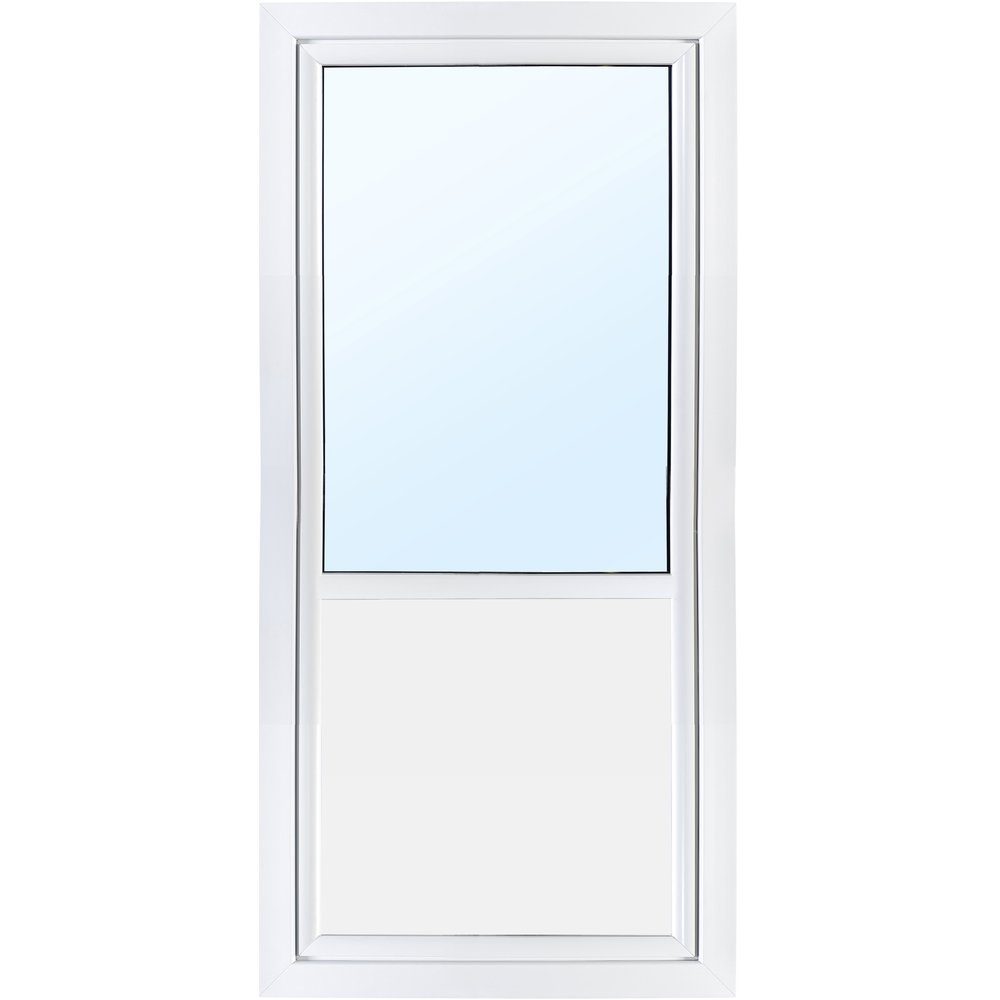 Vinduesdør med brystning (PVC-panel) med 3-glas (2 isoleringsglas, termofloat 4/14ST/4/14ST/4). Døren er sidehængt og åbner udad. Vinduesdøren har en brystning, vælg nedenfor, hvor stor glasruden skal være, med hvidmalet karm som standard (andre farver fås som tilvalg). U-værdien ligger på 0,96. Du kan også tilkøbe mellemglasvinduessprosse i forskellige designs.