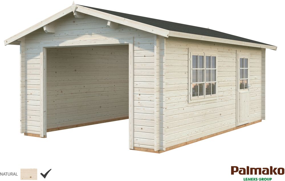 Dette byggesæt kommer uden porte. Denne garage fås også med en sidehængt port eller en tag-skydeport.