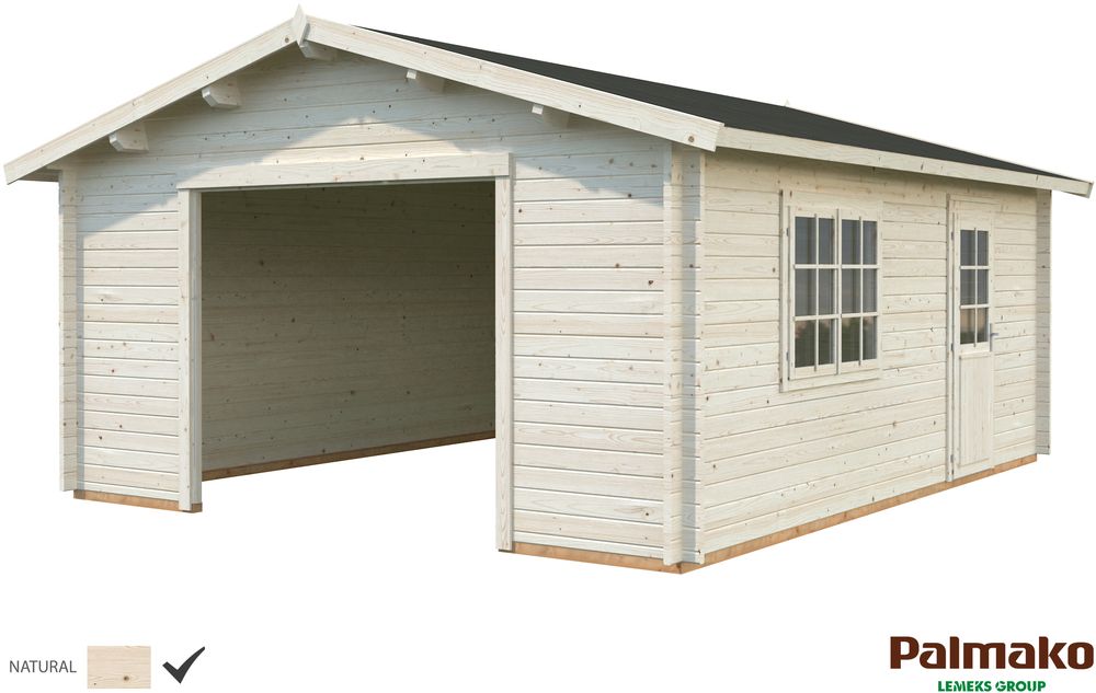 Dette byggesæt kommer uden porte. Denne garage fås også med en sidehængt port eller en tag-skydeport.