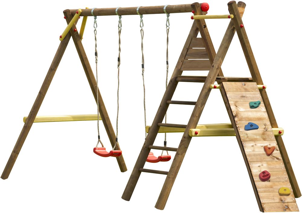 Stativet ledsages af en klatrevæg med klatresten og to gynger. Du kan også vælge at tilkøbe en rutsjebane, der kommer i flere forskellige farver, samt andre former for gynger.