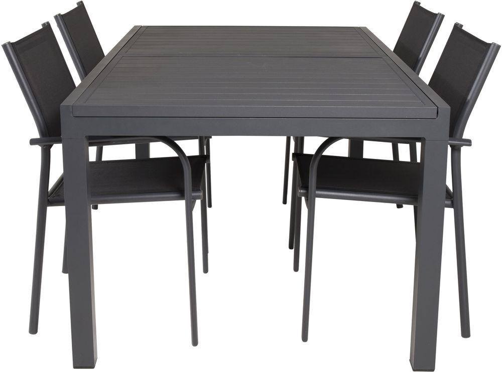 Spisegruppe med et bord og 4 stykker stole. Stolene er lavet af Aluminium/Tekstilerne og bordet er lavet af Aluminium. Stolene kan stables.