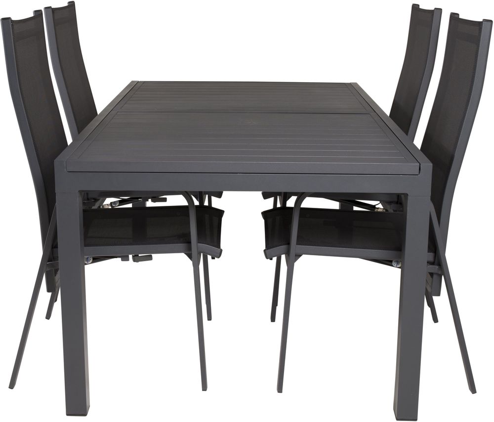 Spisegruppe med et bord og 4 stykker stole. Stolene er lavet af Aluminium/Tekstilerne og bordet er lavet af Aluminium. Stolene kan stables.