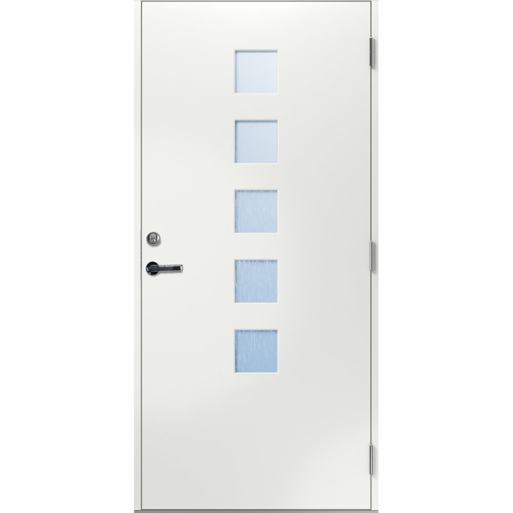 De fem vinduer i døren er i velisolerende 3-glas kassetter med argonfyld mellem ruderne.