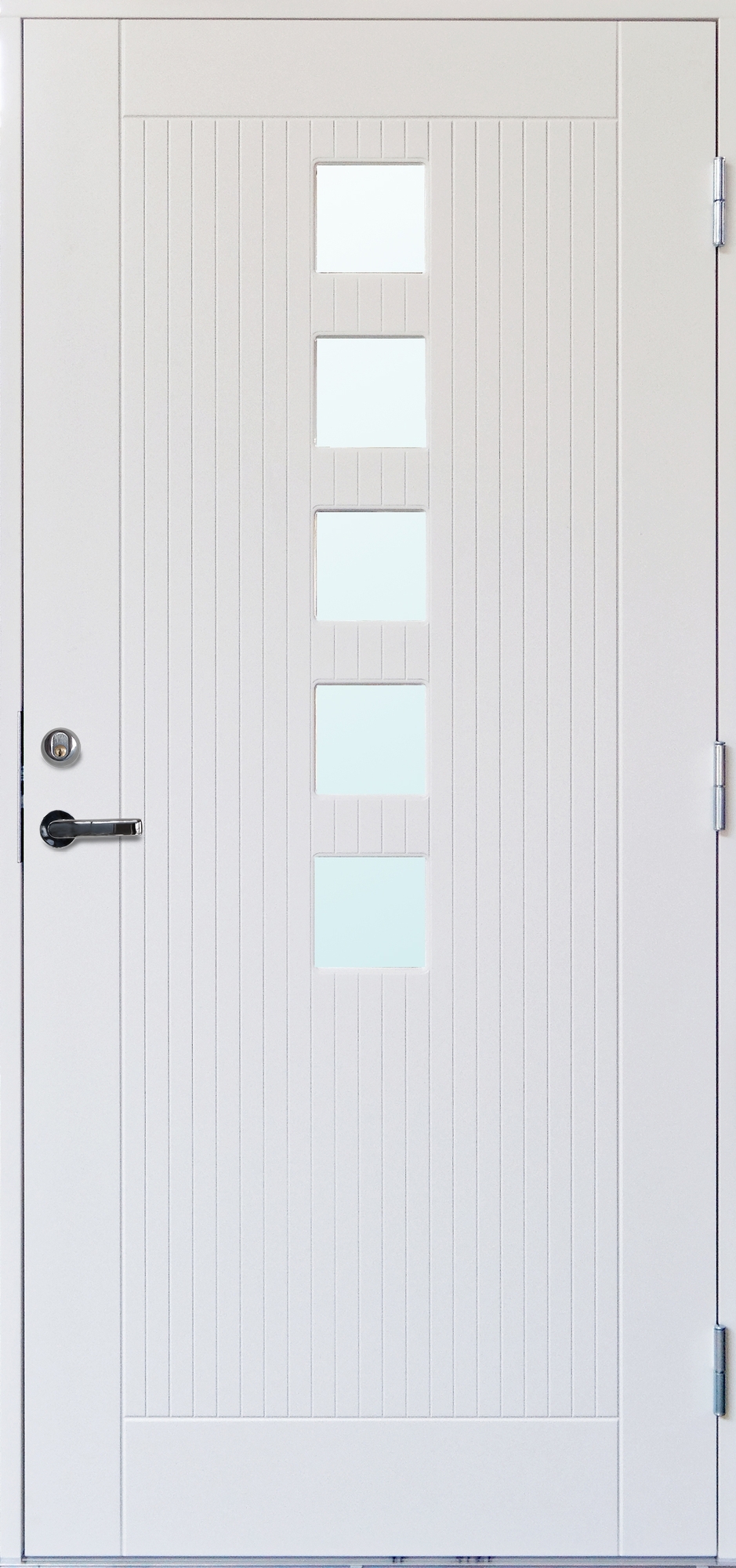 Yderdør Sabina med glas er en velindrettet moderne dør med meget karakter. De fræsede linjer indrammer de fem små firkantede vinduer. Disse giver et flot lysindfald i din entré og kan fås med gennemsigtighed, hvis du vælger klart glas, eller gennemsigtighedsbeskyttelse, hvis du vælger matteret glas eller cotswold glas. Døren passer perfekt til den moderne arkitektur.