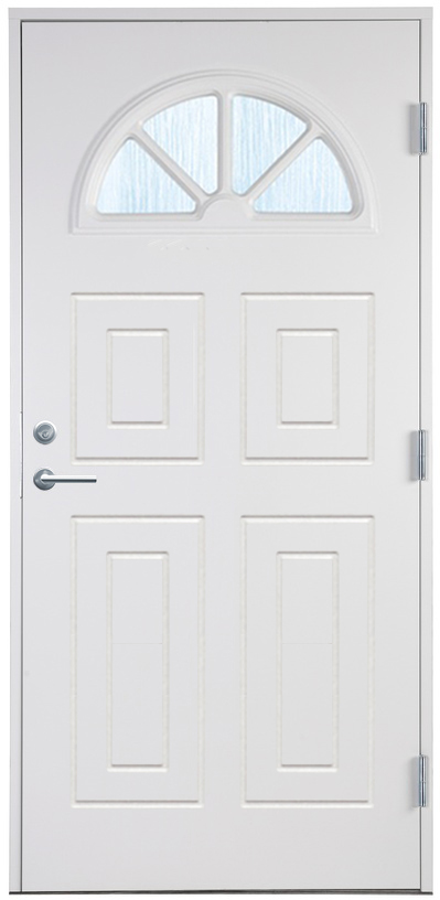 Yderdør Vadstena med glas har et lækkert halvmånevindue med sprosser, der kan fås i forskellige glasudformninger, og som uanset dit valg af glas bidrager til et flot lysindfald i din hall. Det rillefræsede mønster danner fire spejle i to størrelser som en fin dekoration med en tredimensionel fornemmelse. Døren passer godt til sommerhuset såsom den traditionelle eller den klassiske arkitektur.