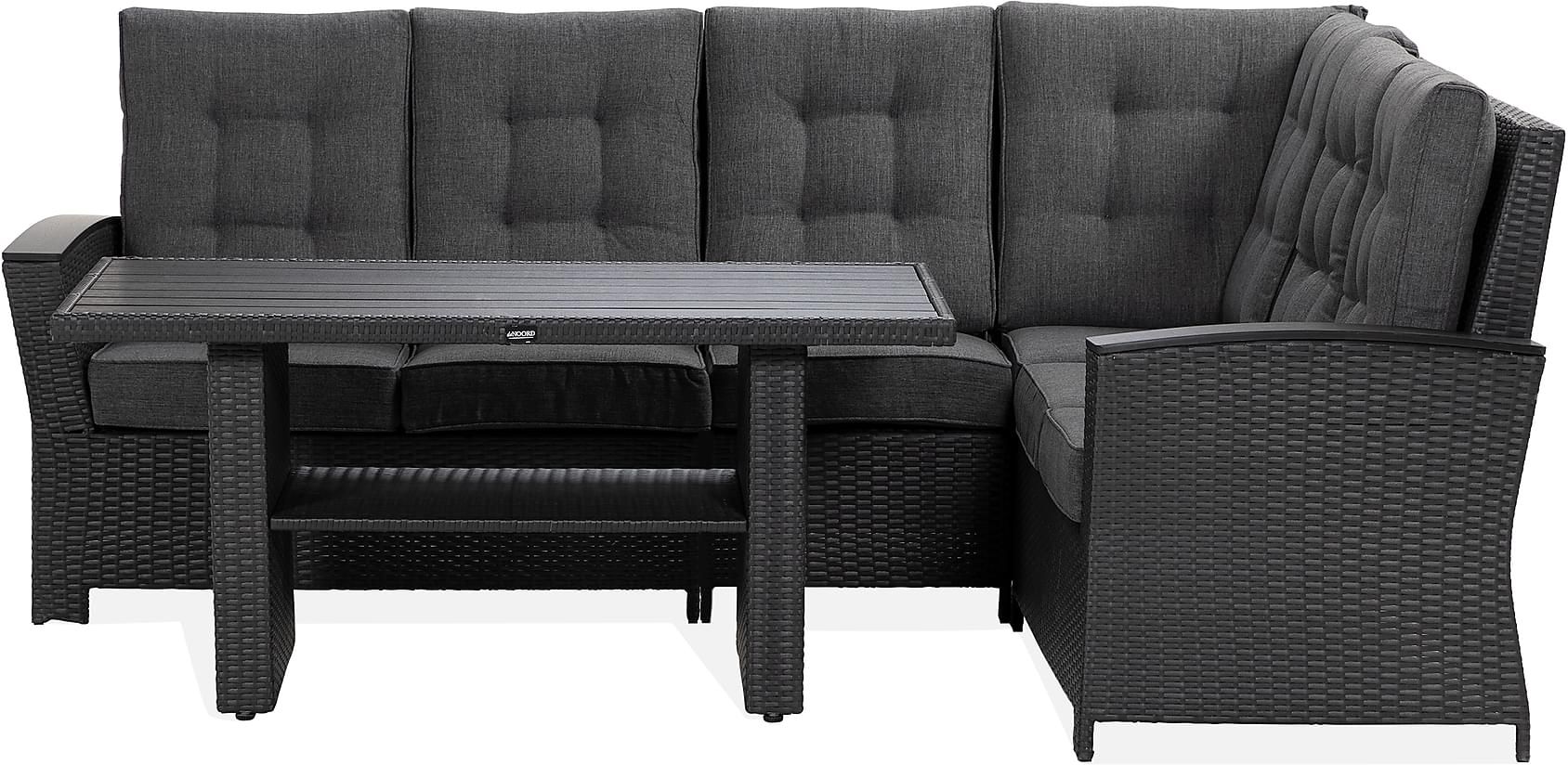 Møblerne er lavet af kunstrattan, et fremragende materiale til udendørs brug. Den holdbare konstruktion er vejrbestandig og kan stå ude året rundt. Materialet er som udgangspunkt vedligeholdelsesfrit og skal kun tørres af med en fugtig klud, hvis det er nødvendigt. Toppladen består af aintwood, et trælignende og letplejet materiale med en overflade, der er nem at tørre af.