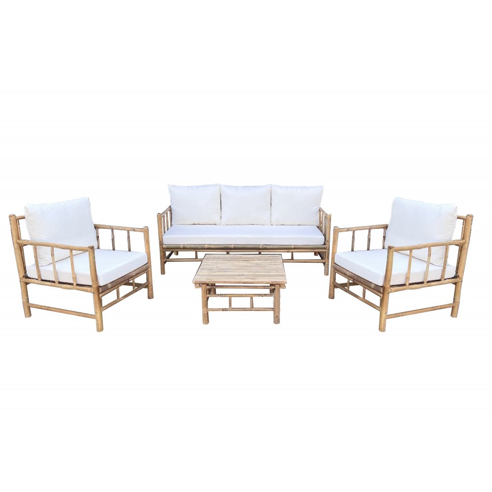 Dette sofasæt består af en 3-personers sofa, to lænestole og et matchende bambusbord. Sammen skaber møblerne et harmonisk og indbydende siddeområde, der er perfekt til afslapning på terrassen eller i haven. Sofagruppen har et stel i naturlig bambus, der giver et varmt og livligt udtryk, mens de bløde hynder i råhvidt stof bidrager til en lys og stilfuld fornemmelse. Kombinationen gør det nemt at matche gruppen med forskellige udendørsmiljøer og indretningsstile.
