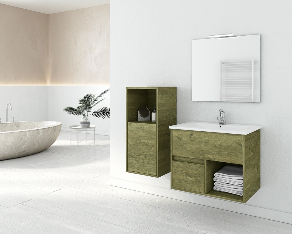Sorrento-møbelpakke fra Nordamist med et naturfarvet væghængt badeværelsesskab i træ, sideskab, porcelænsplade & integreret porcelænshåndvask, vægspejl-enhed og belysningspakken Celia.