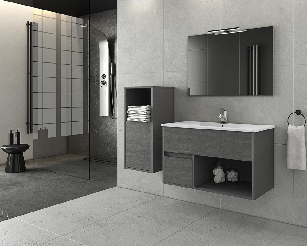 Sorrento-møbelpakke fra Nordamist med et grafitfarvet væghængt badeværelsesskab i imiteret eg, sideskab, porcelænsplade & integreret porcelænsvask, vægspejl-enhed og belysningspakken Celia.