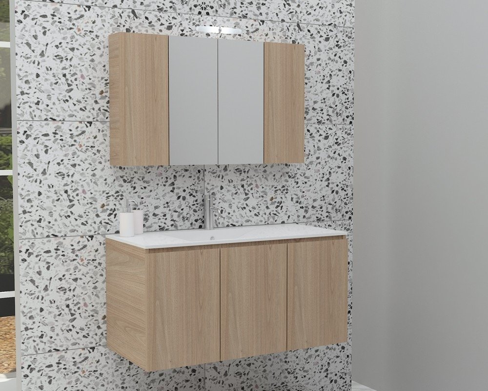 Verona-møbelpakke fra Nordamist med beige vægmonterede badeværelsesskab, porcelænshåndvask og et spejlskab.