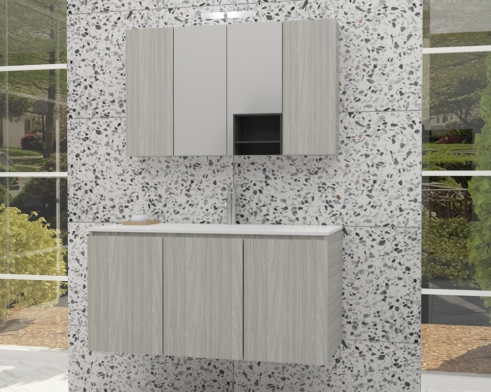 Verona-møbelpakke fra Nordamist med et gråt vægmonteret badeværelsesskab, porcelænshåndvask og et spejlskab.