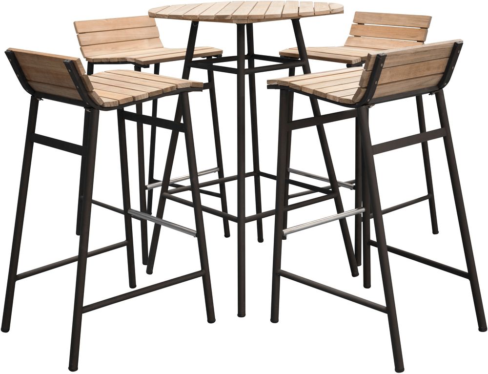 Møbelgruppe med fire stole og et bord. Stel af sort metal og sæde- og bordoverflade af akacia.