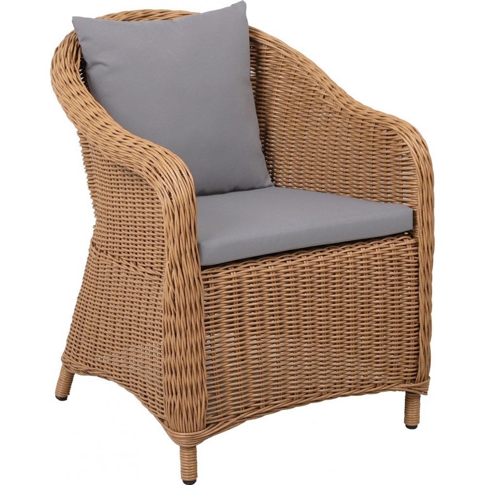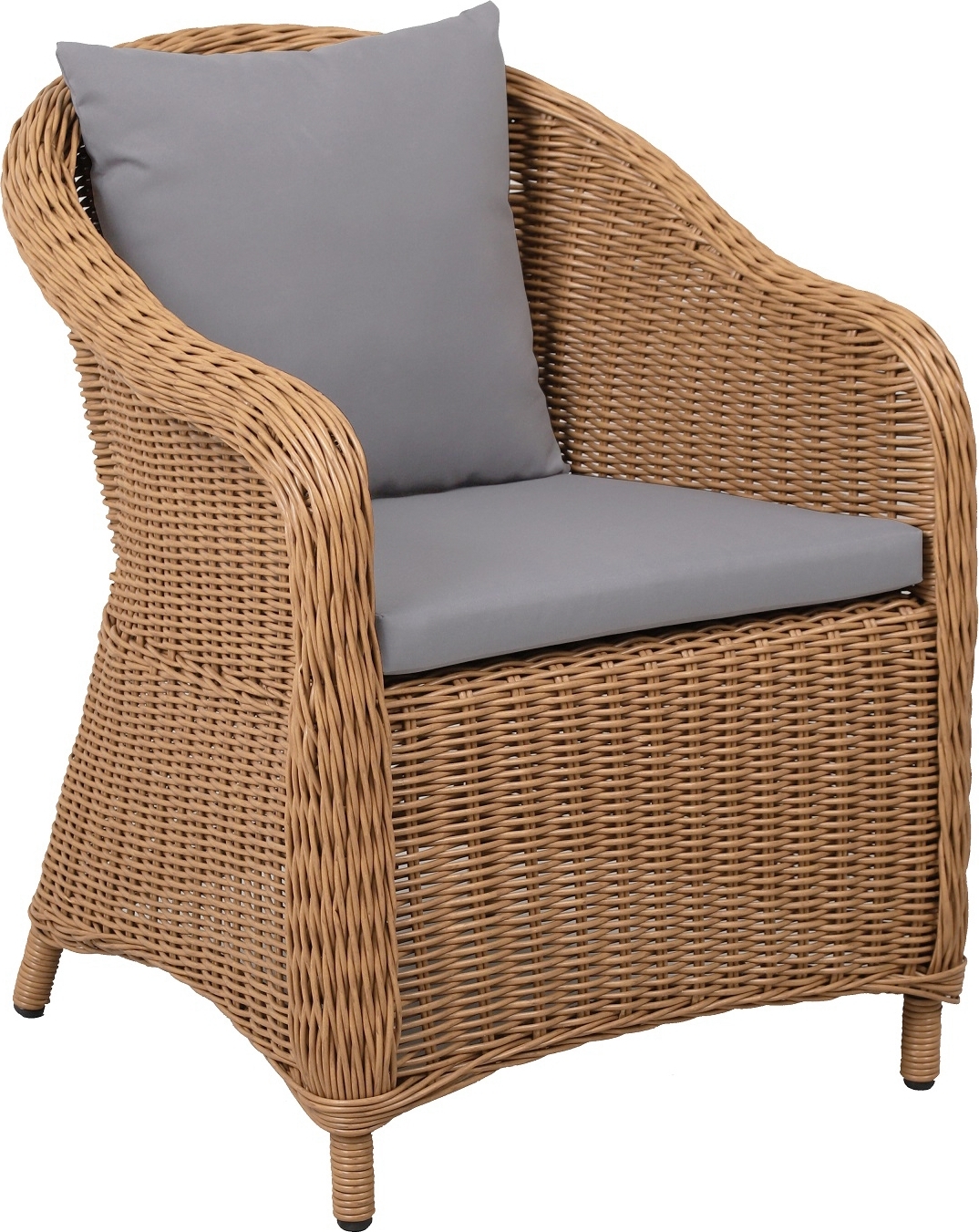 En hyggelig udendørsstol med klassisk design. Stolen er lavet med aluminiumsstel og naturfarvet kunstrattan. Lænestolen kan både bruges som spisebordsstol på terrassen eller som loungelænestol.