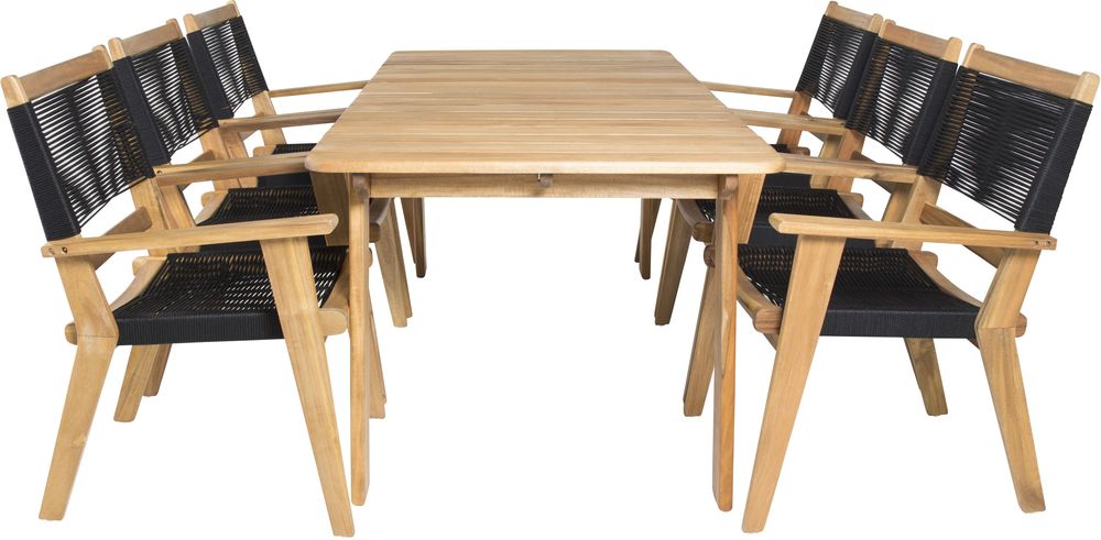 Spisegruppe med et bord og 6 stykker stole. Stolene er lavet af Akacia/Reb og bordet er lavet af Akacia.