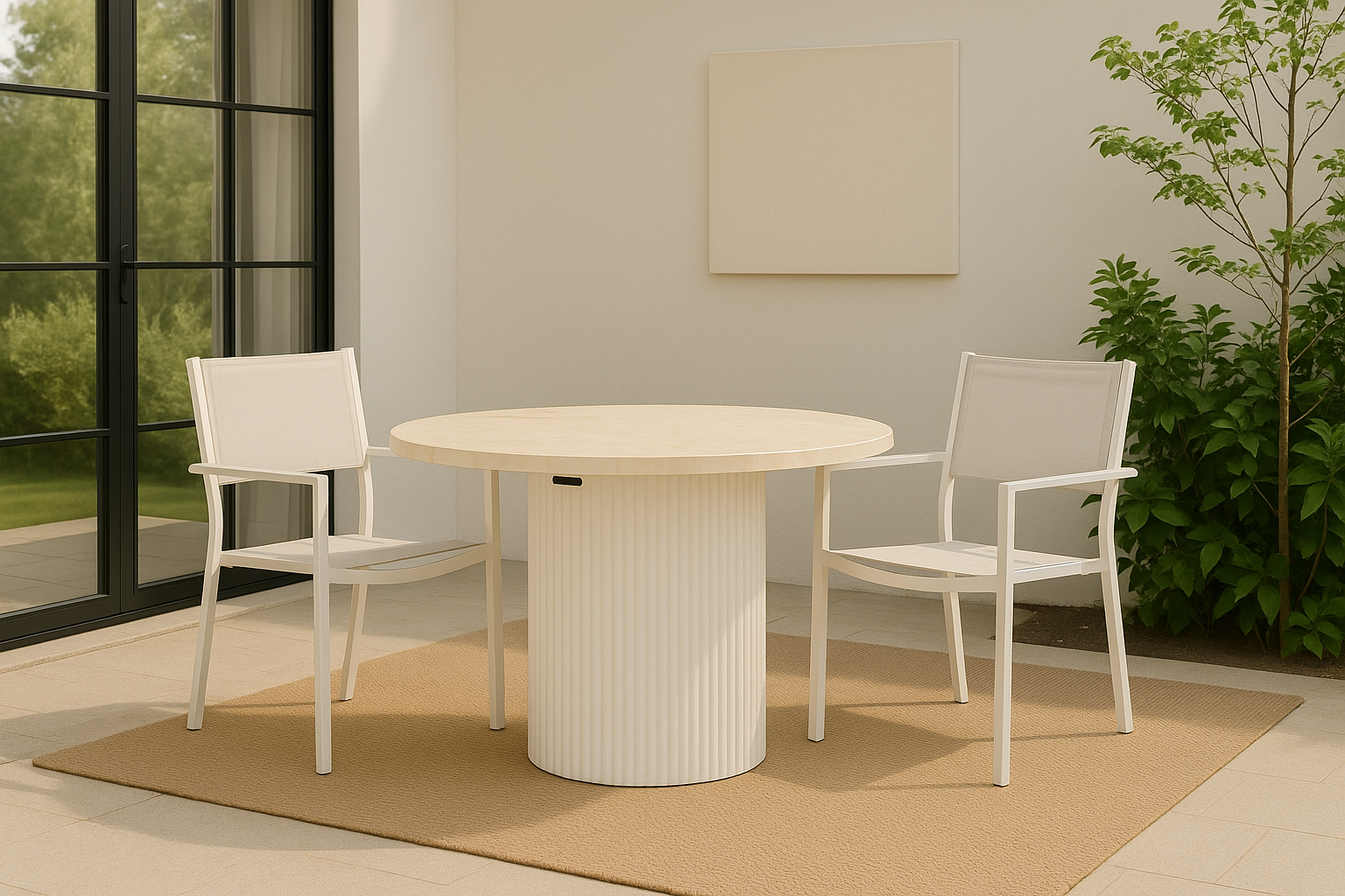 Spisegruppe til terrassen. Rundt bord med 4 komfortable Mercury lænestole.