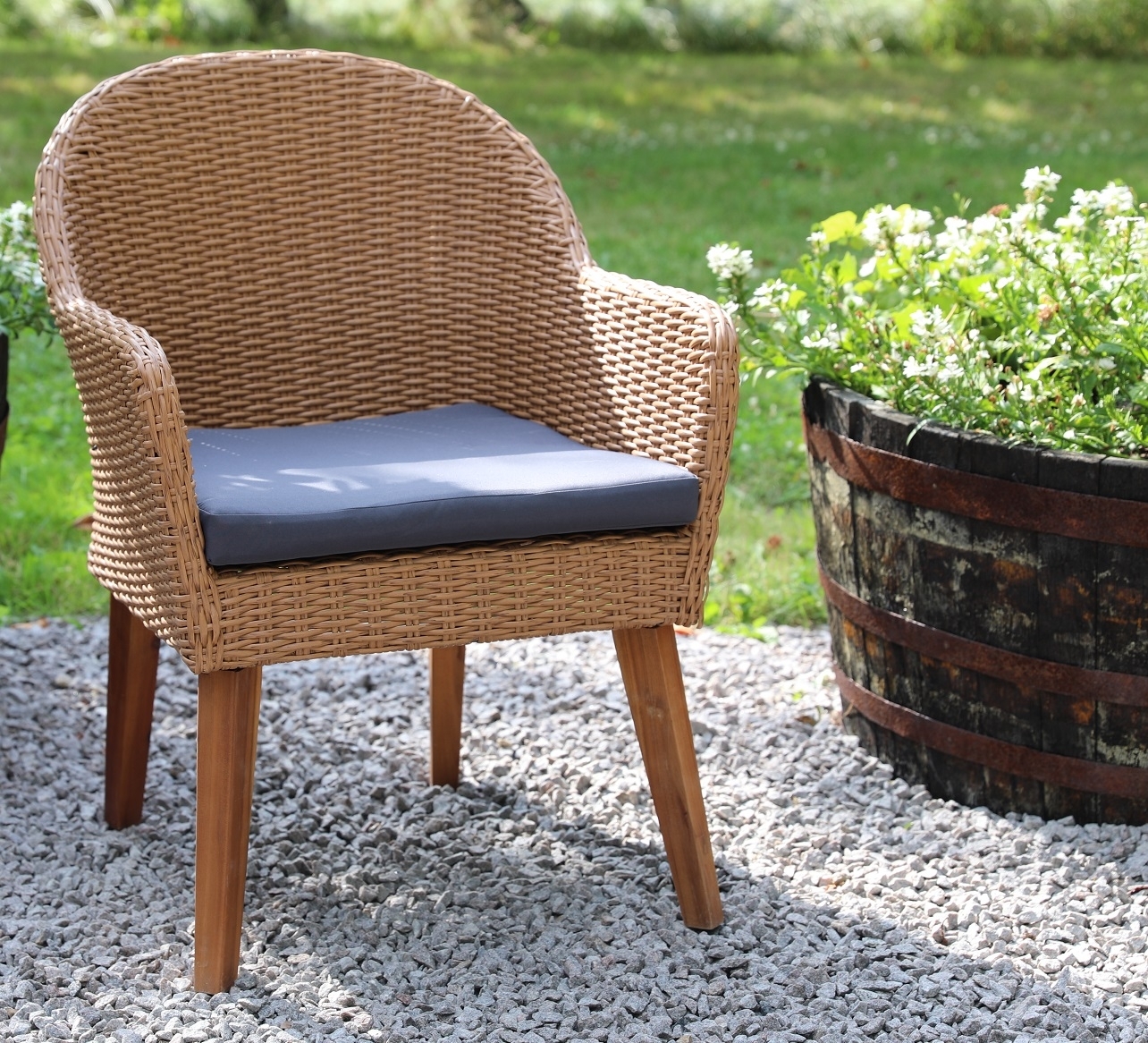 Havestolene, der indgår i denne udendørsmøbelgruppe, er Valetta og har en flot naturfarvet kunstrattan med brune ben og en mørkegrå sædehynde. Denne udendørs møbelgruppe indeholder 6 stole.