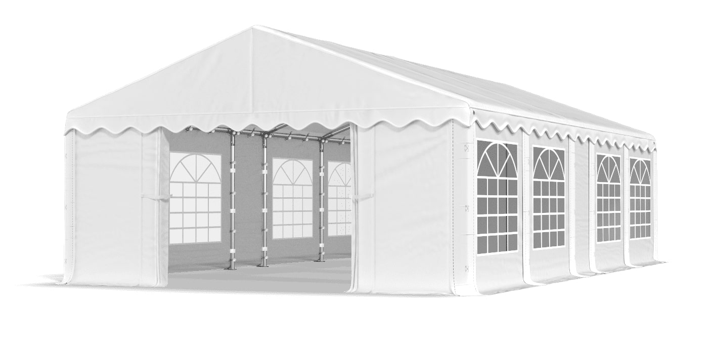 Sidevæggene er udført i tyk og slidstærk PE presenning 240g/m2 med stort funktionelt dekorativt vindue med lameller. Højden på væggene er 2 m. Ved hjælp af vinduerne placeret på hvert to-meter segment får teltet et mere visuelt tiltalende design, hvilket gør det perfekt til studenterfester, fester, fester samt udstillinger og events. Vinduerne lader dagslyset trænge ind, hvilket giver en behagelig og afslappende følelse ved udendørs ophold, samtidig med at den beskytter mod utøj og uønsket vejr. Væggene monteres på hvert to-meters segment ved hjælp af specielle elastikbånd, som også giver dig mulighed for frit at fjerne vægge for ekstra åbninger, så du kan tilpasse dine egne behov.