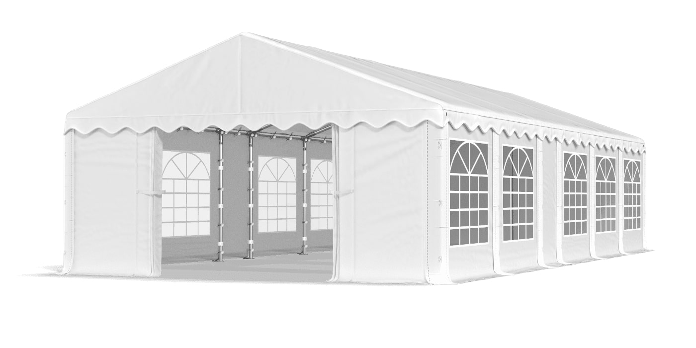 Sidevæggene er udført i tyk og slidstærk PE presenning 240g/m2 med stort funktionelt dekorativt vindue med lameller. Højden på væggene er 2 m. Ved hjælp af vinduerne placeret på hvert to-meter segment får teltet et mere visuelt tiltalende design, hvilket gør det perfekt til studenterfester, fester, fester samt udstillinger og events. Vinduerne lader dagslyset trænge ind, hvilket giver en behagelig og afslappende følelse ved udendørs ophold, samtidig med at den beskytter mod utøj og uønsket vejr. Væggene monteres på hvert to-meters segment ved hjælp af specielle elastikbånd, som også giver dig mulighed for frit at fjerne vægge for ekstra åbninger, så du kan tilpasse dine egne behov.