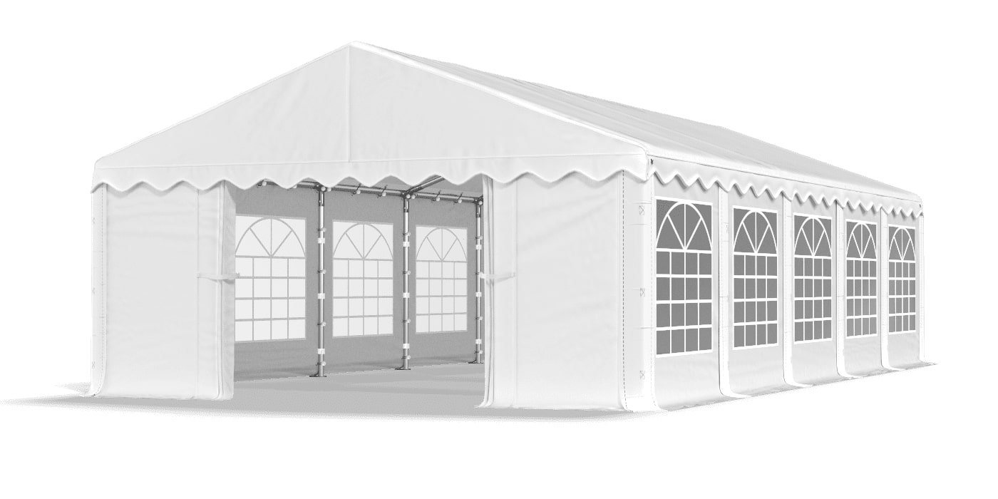 Sidevæggene er udført i tyk og slidstærk PE presenning 240g/m2 med stort funktionelt dekorativt vindue med lameller. Højden på væggene er 2 m. Ved hjælp af vinduerne placeret på hvert to-meter segment får teltet et mere visuelt tiltalende design, hvilket gør det perfekt til studenterfester, fester, fester samt udstillinger og events. Vinduerne lader dagslyset trænge ind, hvilket giver en behagelig og afslappende følelse ved udendørs ophold, samtidig med at den beskytter mod utøj og uønsket vejr. Væggene monteres på hvert to-meters segment ved hjælp af specielle elastikbånd, som også giver dig mulighed for frit at fjerne vægge for ekstra åbninger, så du kan tilpasse dine egne behov.