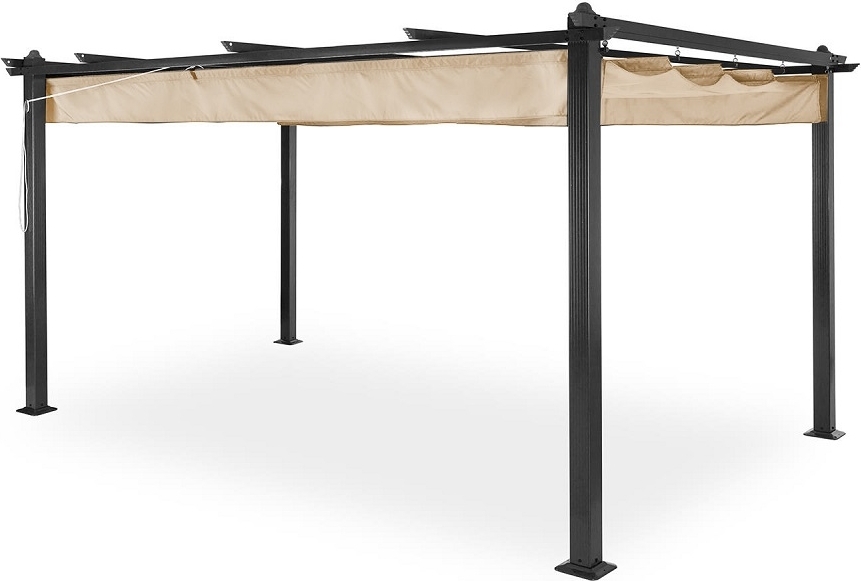 En stilfuld og funktionel pergola, der giver dejlig skygge og beskyttelse på terrassen. Konstruktionen er lavet af pulverlakeret aluminium med en mørkegrå finish, hvilket giver både stabilitet og et moderne udseende. Det beige polyestertagstof er belagt med PU, hvilket gør det vandafvisende og samtidig giver effektiv solbeskyttelse.