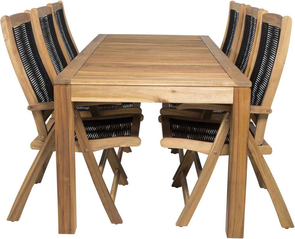 Spisegruppe med et bord og 6 stykker stole. Stolene er lavet af Akacia/Reb og bordet er lavet af Akacia.